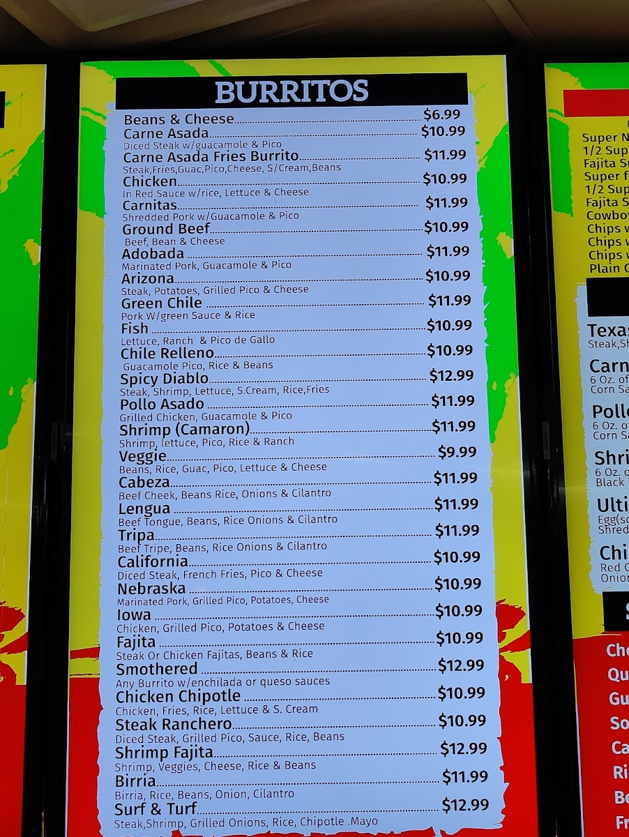 Beef. meat, cheese and beans. chicken. meat, cheese, lettuce and rice.